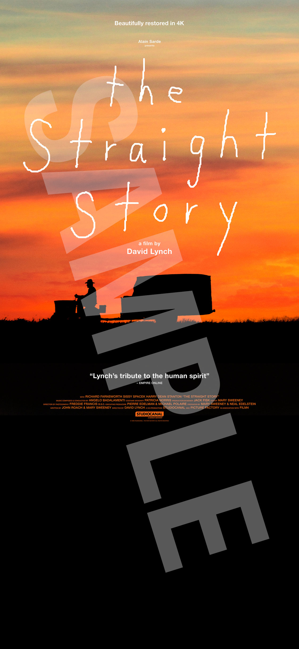 73歳のアルヴィン・ストレイトという老人が長らく仲違いしていた兄が心臓発作で倒れたことを知り、560kmの道のりを時速8kmのトラクターに乗って会いに行ったという実話をデヴィッド・リンチが信頼するスタッフ&キャストとともに監督。愛すること、許すことをシンプルに描き、大ヒットした永遠の感動作。トウモロコシ畑をトラクターがゆっくりと進んでゆく広大な風景が心に残る物語とともに美しい4Kリマスターでスクリーンに甦る。