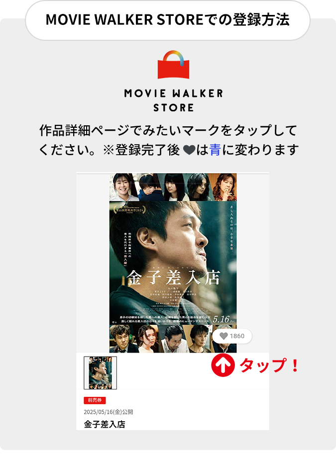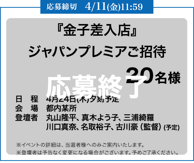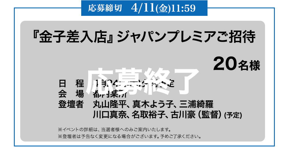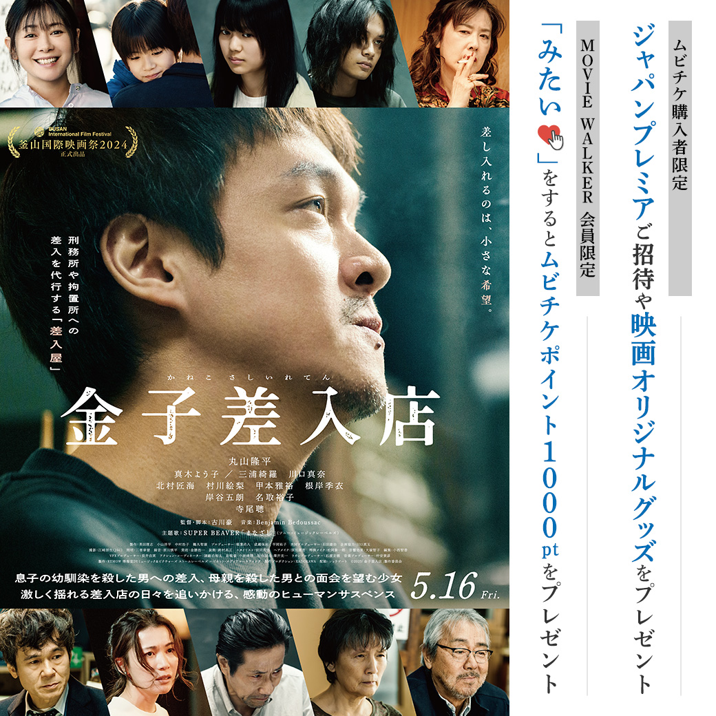 『金子差入店』に「みたい」登録するだけで、抽選で100名様にムビチケポイント1000ptが当たるチャンス!さらに、ムビチケ前売券(オンライン・カード)を購入して応募すると、ジャパンプレミアご招待や映画オリジナルグッズをプレゼント!