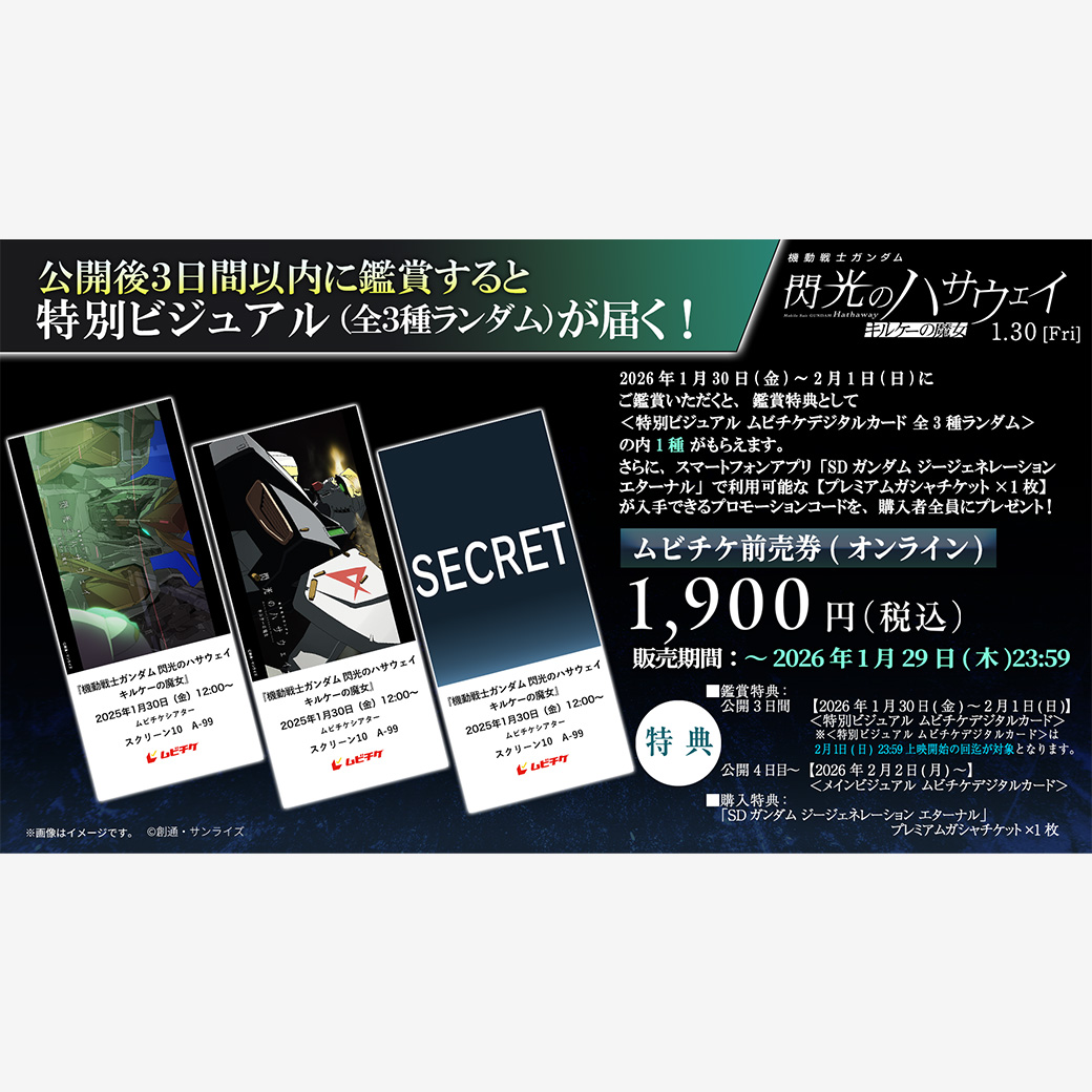 ムビチケ前売券(オンライン) を購入すると、スマートフォンアプリ「SDガンダム ジージェネレーション エターナル」で利用可能な【プレミアムガシャチケット】が入手できるプロモーションコードをもれなくプレゼント!